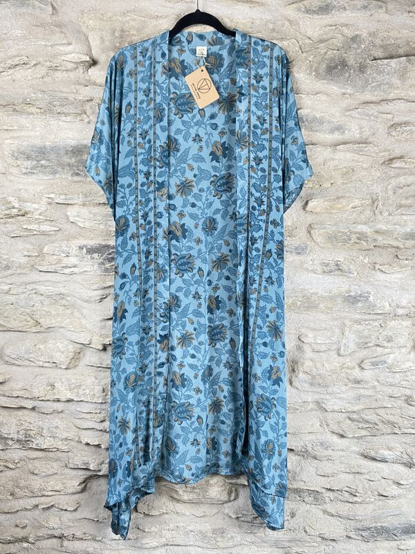 LONG KIMONO STYLE JACKET ONE SIZE UK10 to 28: blue-grey, floral listed in: