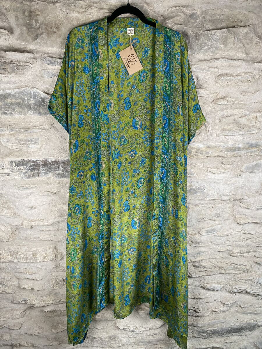 LONG KIMONO STYLE JACKET ONE SIZE UK10 to 28: romantic mossy green and sky blue listed in: