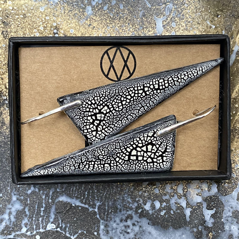 Large triangular porcelain drops earrings: white crackle over black listed in: