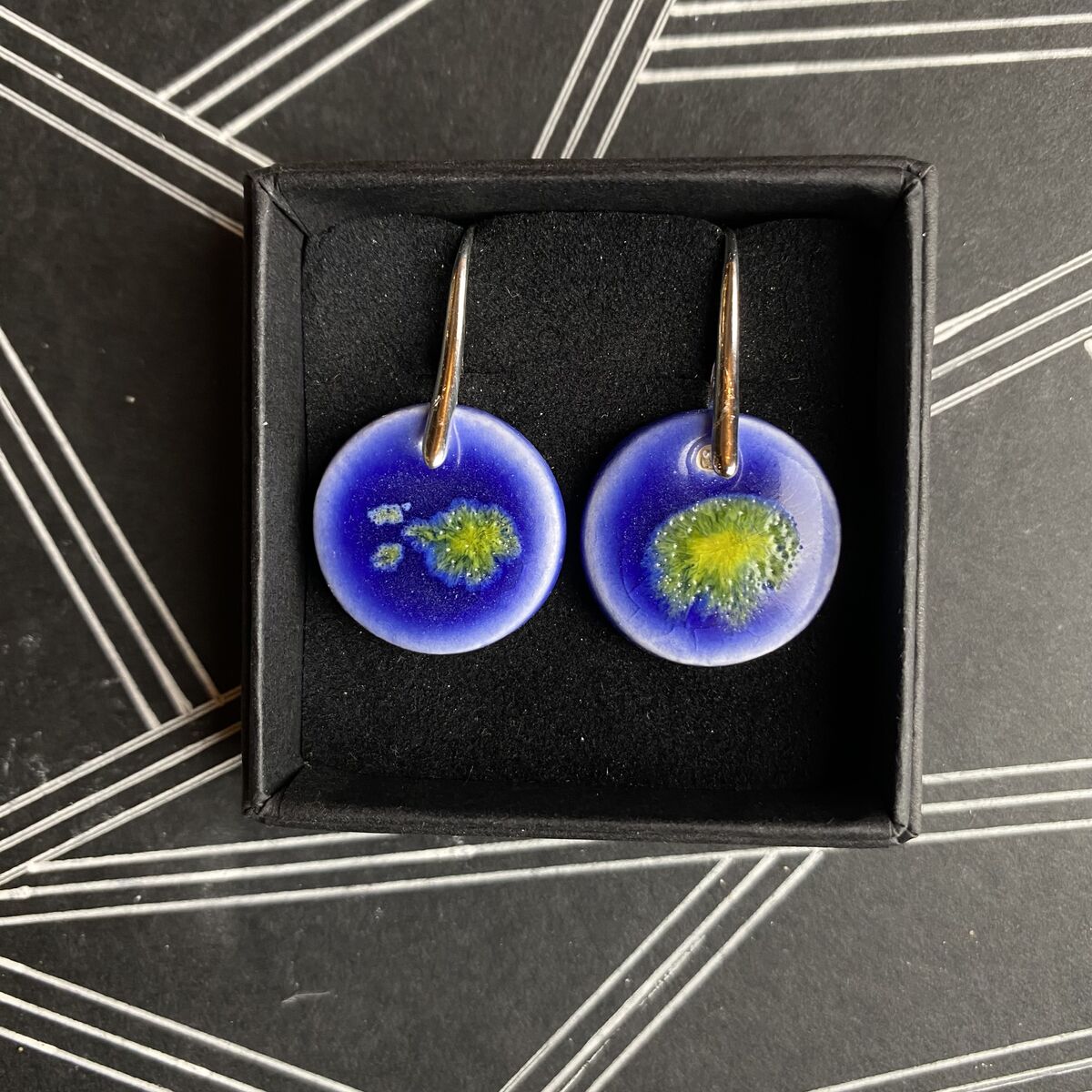 Handmade porcelain and enamel round drop earrings with sterling silver hooks.