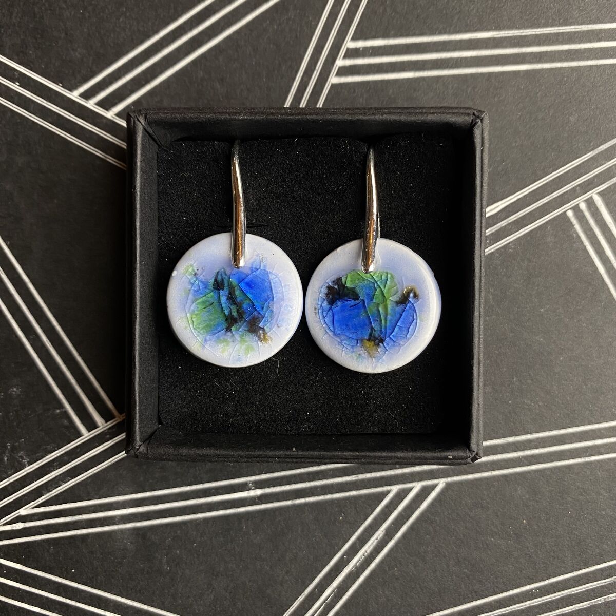 Handmade porcelain and enamel round drop earrings with sterling silver hooks.