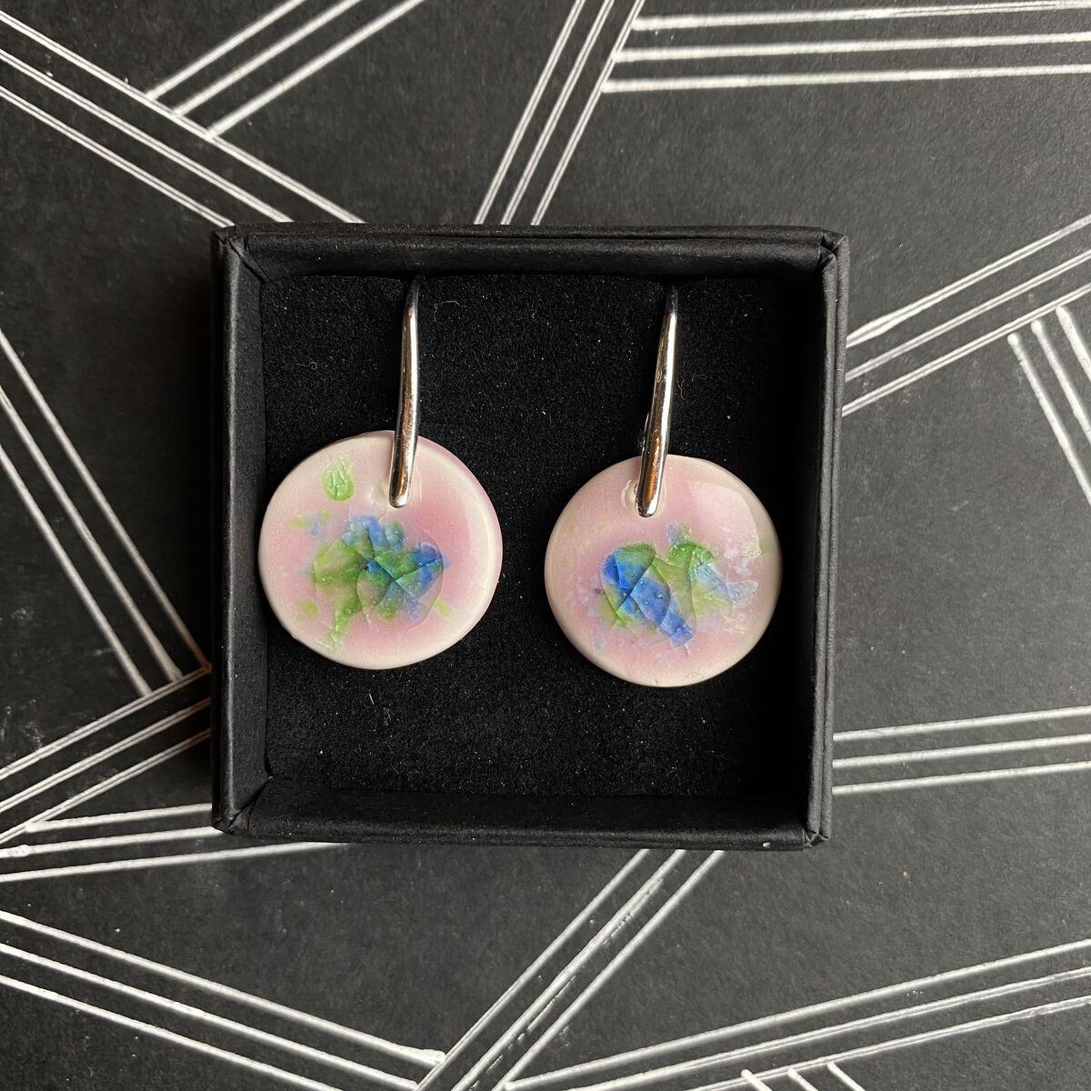 Handmade porcelain and enamel round drop earrings with sterling silver hooks.