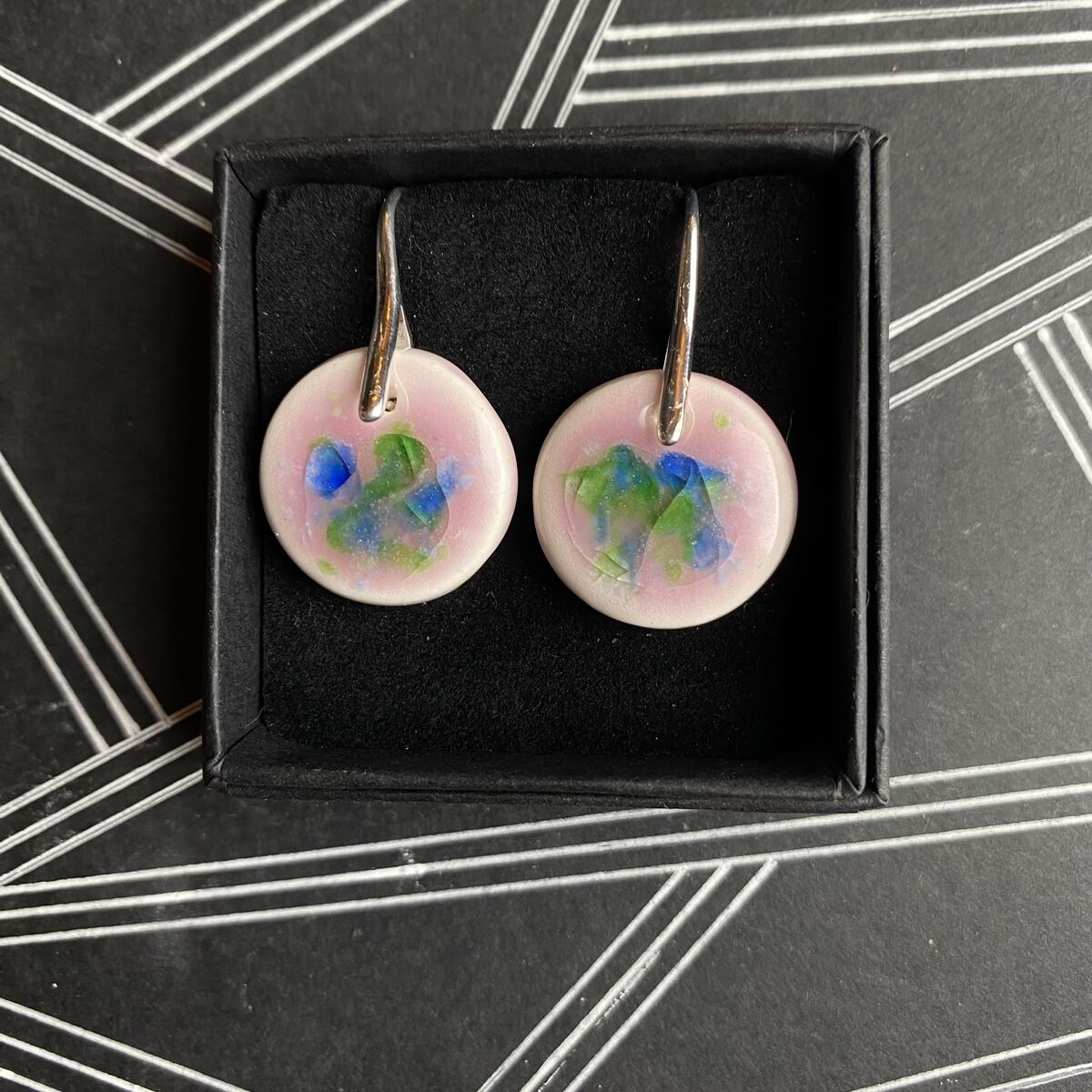 Handmade porcelain and enamel round drop earrings with sterling silver hooks.