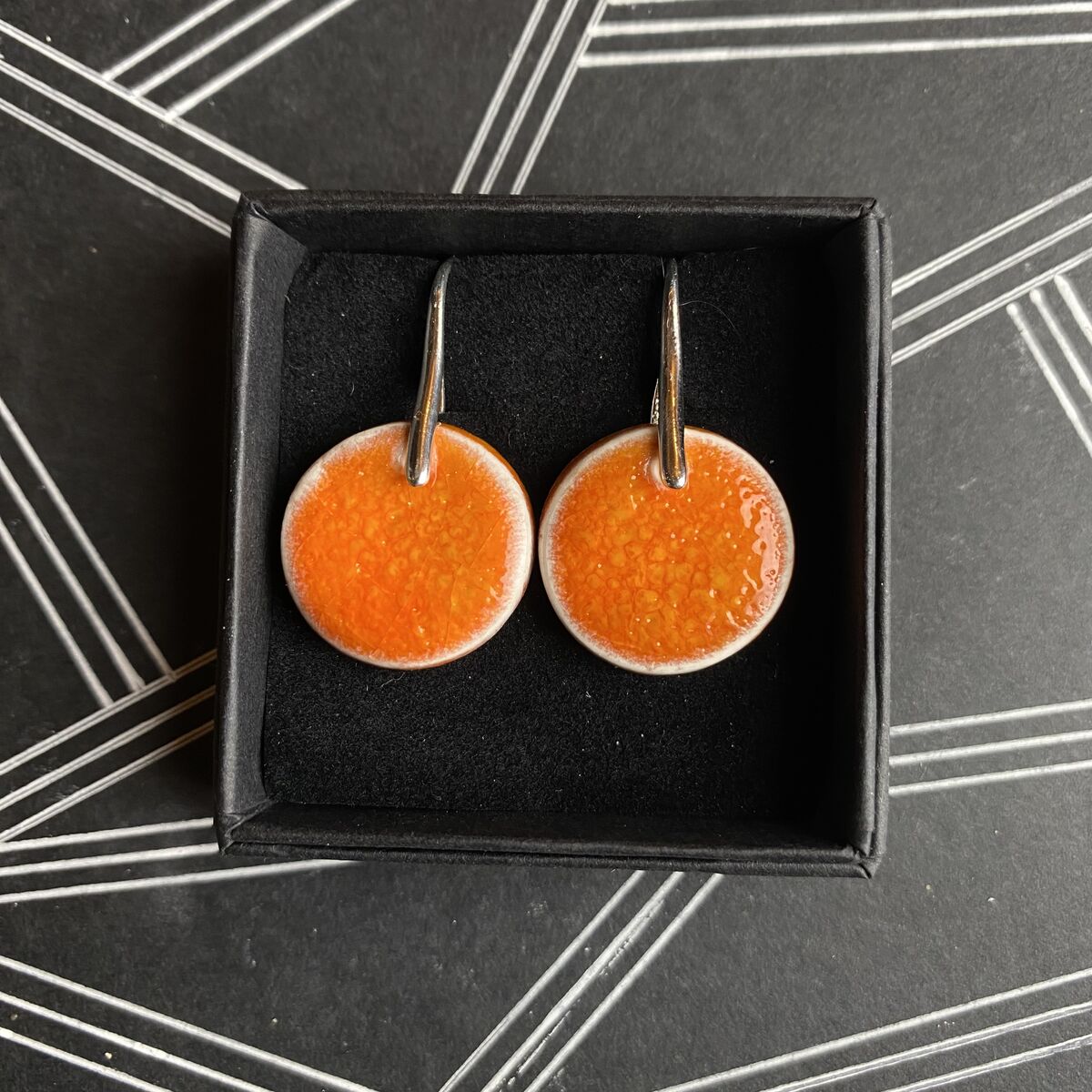 Handmade porcelain and enamel round drop earrings with sterling silver hooks.