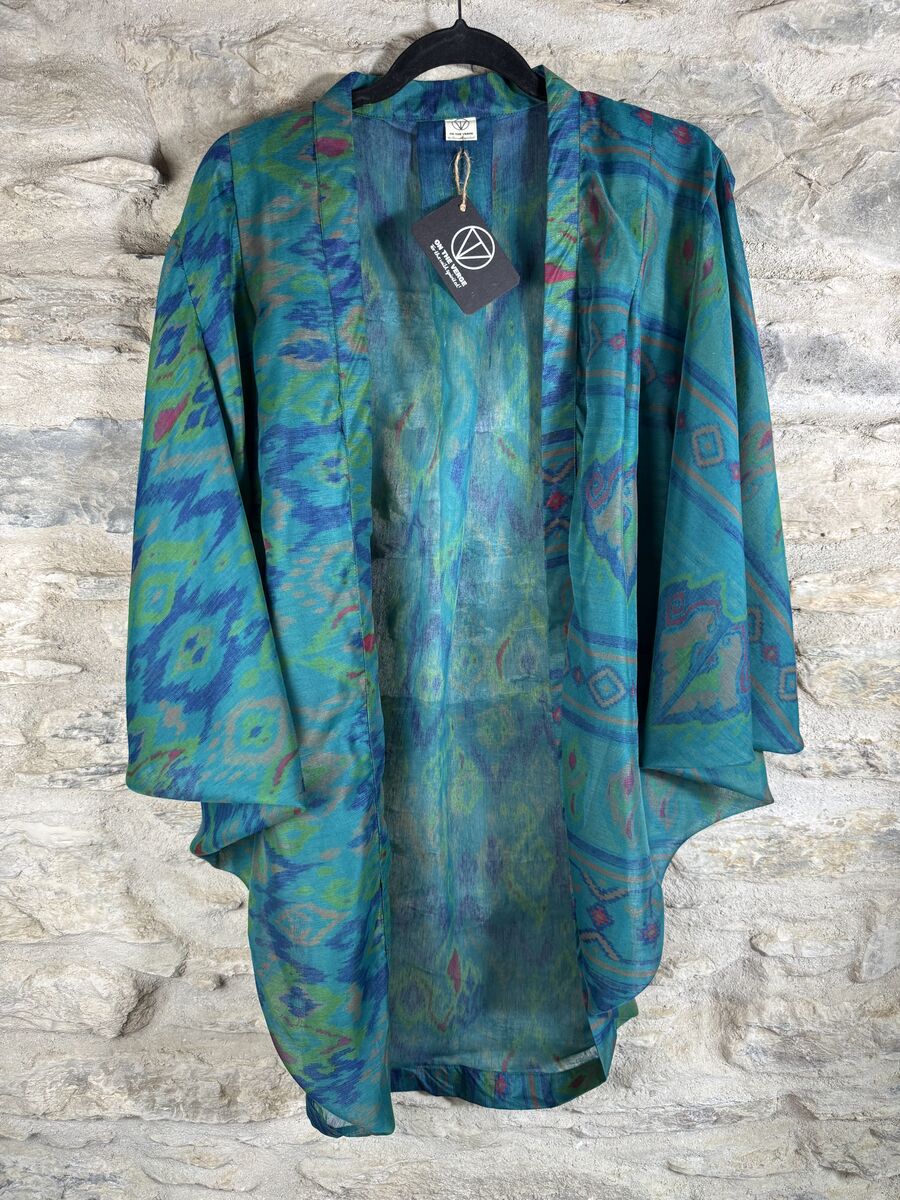 This kimono style jacket is to be worn open, it has a round cut in the back, triangular shape sleeves going below elbows